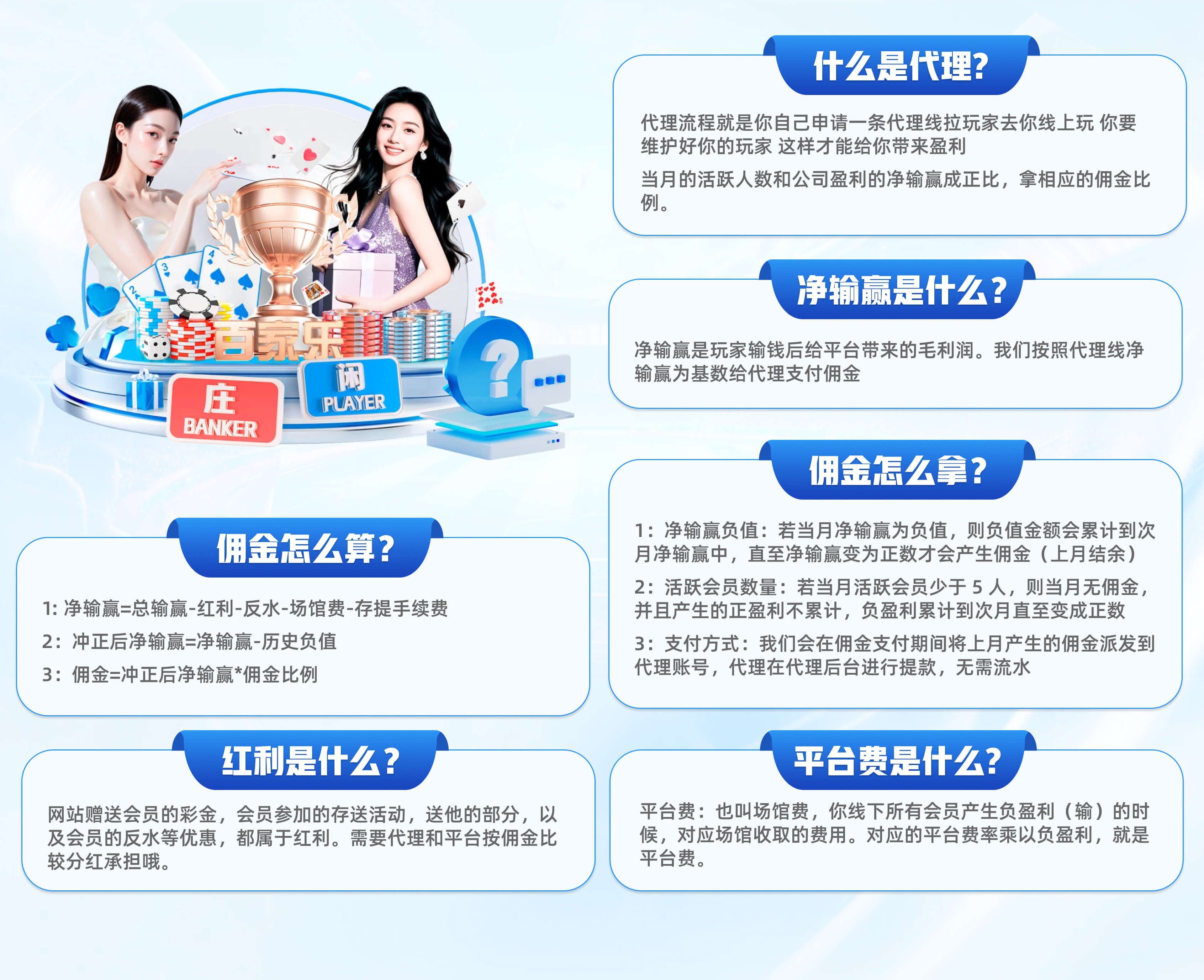 玩家无论下注百家乐、电子、彩票、足球、任何彩种,客损佣金首三个月都享55%,做代理相当于有55%佣金+人头费+流水提成+私人福利,四层分红!佣金月结最低需要5个活跃会员。